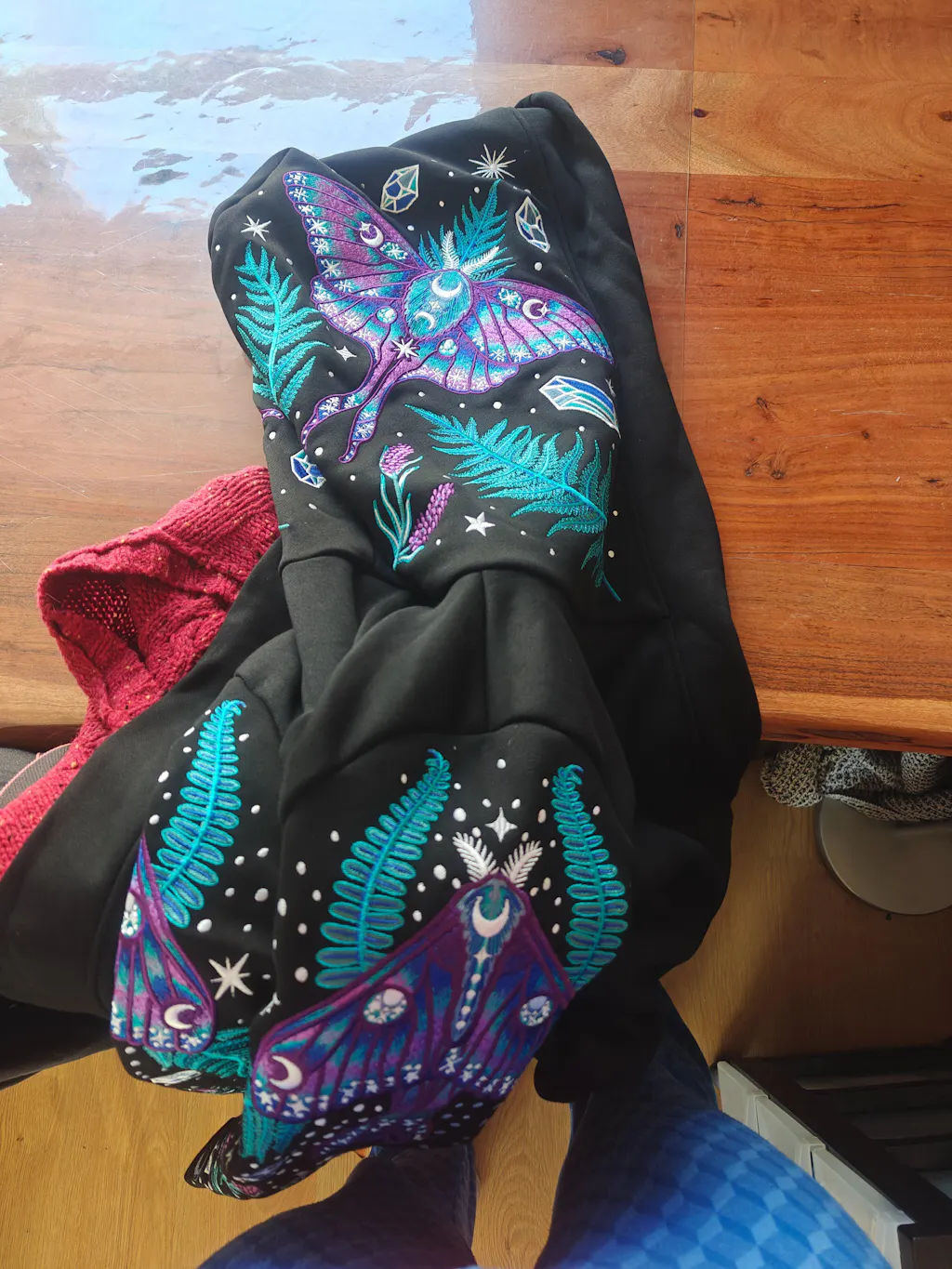 Does your Gothic clothing style not stop you from expressing your love for nature and everything above? Then Restyle may steal your heart with this beautiful hoodie made of wonderfully thick cotton! It features beautiful embroidery on the hood and sleeves and can be worn open or closed thanks to the waist cord. Truly magical!