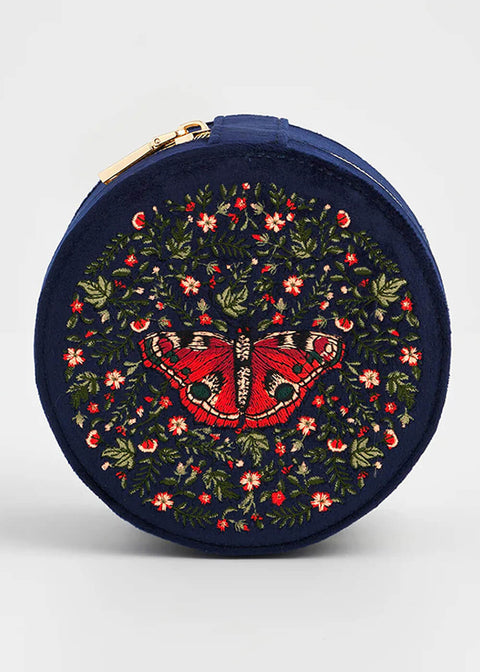 Adorning the navy velvet is a butterfly, delicately embroidered to take your breath away and capture your heart. This jewelry box made from faux leather and covered in soft velvet is compact at 14 cm wide, yet provides space for rings, earrings, and other small treasures. The thick outer edges ensure that your jewelry stays safe, secured by a zipper closure all around.
