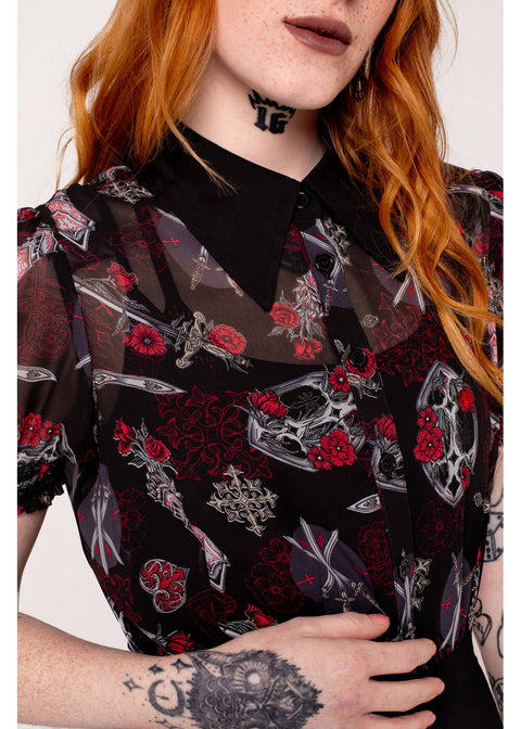 Denne chiffonbluse er semitransparent og let, men stemningen er alt andet end blød: Clarimond-printet med sværd er knivskarpt, og den sorte spidse krave holder looket stramt og skarpt. Det er blusen, der straks giver dit outfit et alternativt kant — er du klar til at slibe din stil?